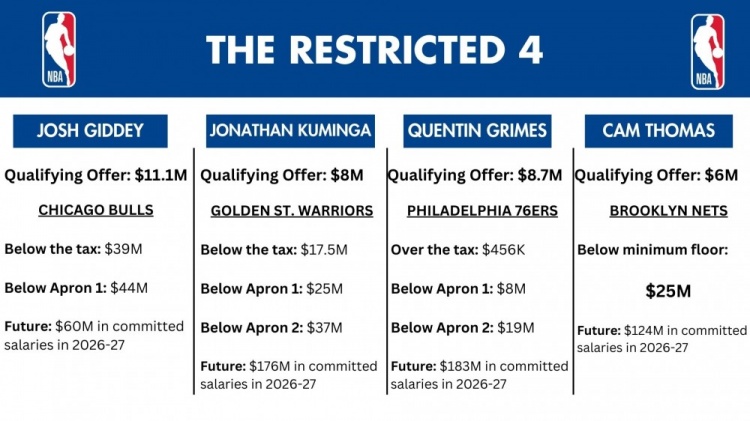 勇士、公牛、76人和篮网此前都开出了资质报价,库明加是一年800万,吉迪1年1110万,格莱姆斯一年870万,托马斯一年600万。